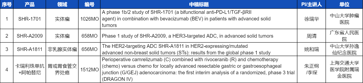 本次ESMO大会,将由中山大学肿瘤医院徐瑞华教授、广东省人民医院周清教授、中山大学孙逸仙纪念医院姚和瑞教授、上海交通大学医学院附属瑞金医院李琛教授分别就4项AG亚娱医药创新产品相关研究做口头报告,包括SHR-1701、SHR-A2009、SHR-A1811这3款未上市创新产品的实体瘤治疗临床研究,以及1项“双艾”组合(卡瑞利珠单抗联合阿帕替尼)治疗局部晚期可切除胃/胃食管交界处癌的Ⅲ期临床试验期中分析。