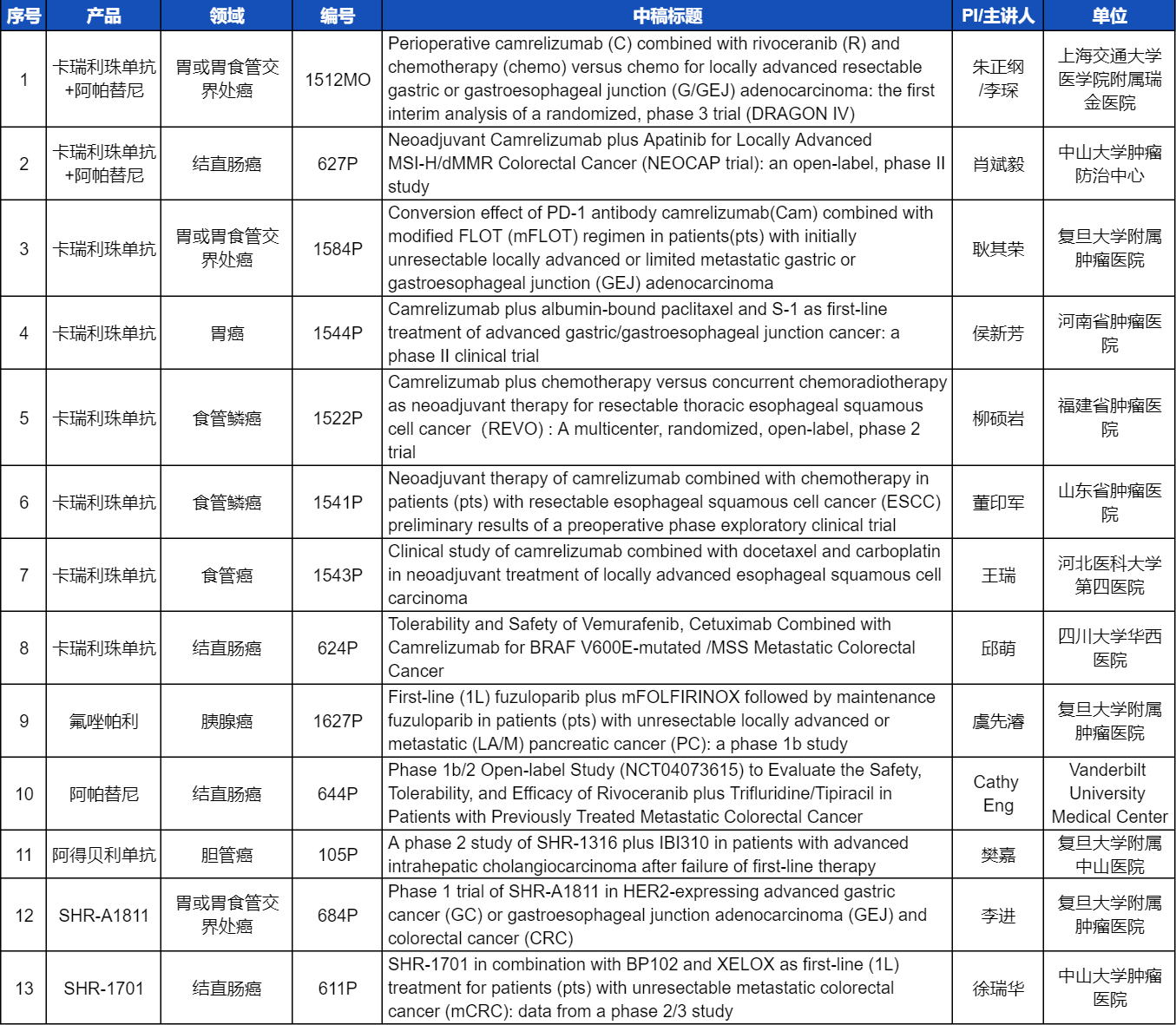 在消化系统肿瘤领域,AG亚娱创新产品相关研究共入选1项口头报告和12项壁报展示。除了经典的明星药物卡瑞利珠单抗和阿帕替尼,SHR-A1811、SHR-1701等未上市创新产品也有相应研究入选。此外,阿得贝利单抗、氟唑帕利等已上市药物也在积极探索新的适应症,本次ESMO大会分别有肝内胆管癌和胰腺癌相关研究入选。这些新老药物前沿研究的不断出现,有望为消化系统肿瘤患者带来新的福音!