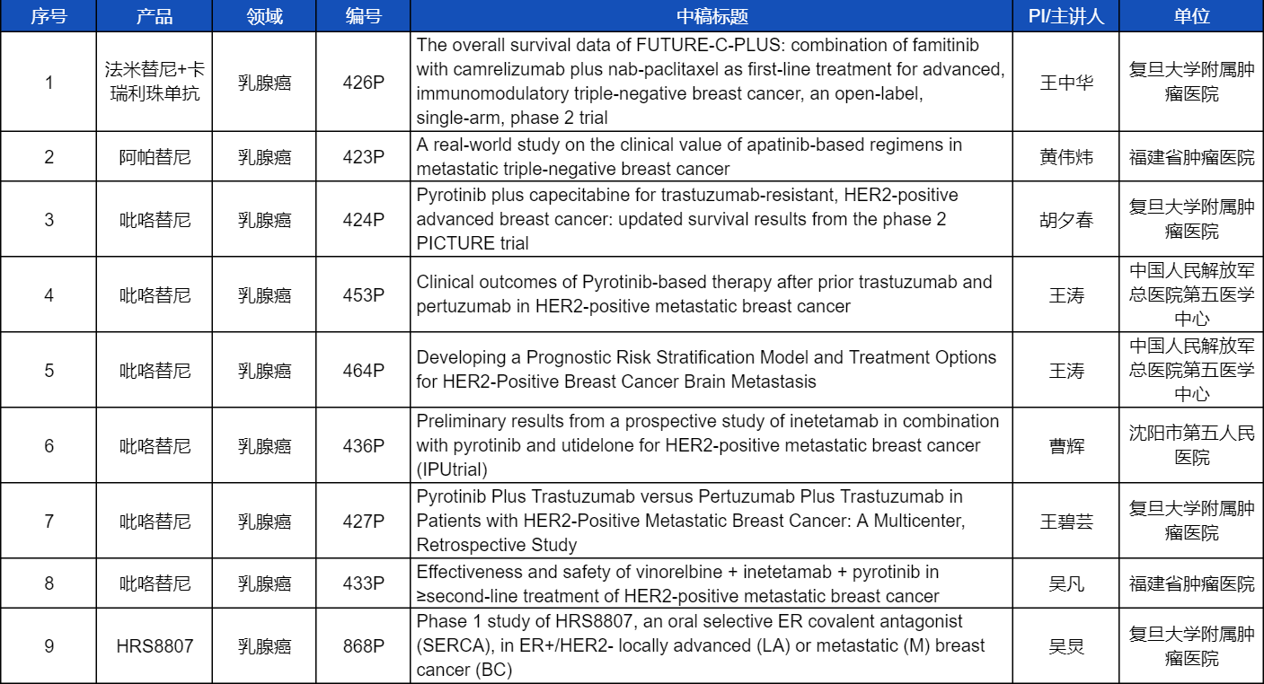 在乳腺癌领域,吡咯替尼、阿帕替尼、卡瑞利珠单抗、法米替尼,或产品间联合或联合化疗,共有9项研究入选壁报讨论,其中吡咯替尼占据6项,较为全面地展示了这款中国首个自主研发抗HER2靶向药在乳腺癌治疗中的显著特点和潜力。此外,AG亚娱医药自主研发的新型选择性雌激素受体共价拮抗剂(SERCA)HRS8807治疗ER+/HER2-局部晚期或转移性乳腺癌的Ⅰ期研究也成功入选,有望为此类患者带来更多用药新选择。
