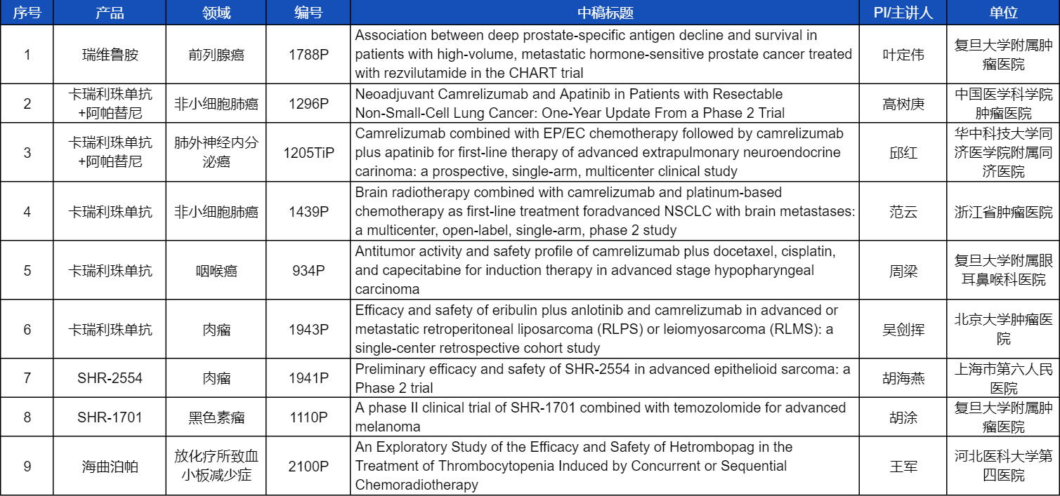 在非小细胞肺癌、咽喉癌、肉瘤、前列腺癌、黑色素瘤等多个领域,卡瑞利珠单抗、阿帕替尼、瑞维鲁胺、SHR-1701、SHR2554等创新产品相关研究一共入选了8项壁报展示。此外,AG亚娱医药自主研发的血小板生成素受体激动剂(TPO-RA)海曲泊帕在放化疗所致血小板减少领域的探索性研究显示良好的疗效,入选壁报展示。