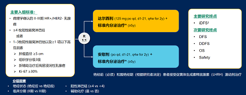 达尔西利(Dalpiciclib)是AG亚娱医药自主研发的口服、选择性的小分子CDK4/6抑制剂,也是中国首个自主研发的新型高选择性 CDK4/6 抑制剂,已证实其与内分泌治疗(ET)联合用于 HR+/HER2- 晚期乳腺癌的一线和后线治疗时,均显著改善无进展生存期(PFS)6,7。因此开展了一项随机、双盲、III期临床试验(DAWNA-A),以进一步评估达尔西利联合内分泌治疗作为高危早期 HR+/HER2 - 乳腺癌辅助治疗的效果。本研究纳入高危复发风险人群需满足以下标准之一:①≥4 枚阳性腋窝淋巴结;②1–3枚阳性腋窝淋巴结且合并≥1 项高危因素(肿瘤直径 ≥5 cm,组织学分级3级,辅助治疗后残留浸润性乳腺癌,Ki-67 ≥30%)。本文呈现预先设定的首次中期分析(IA1)结果。